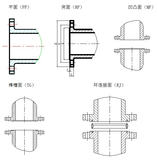 法蘭密封面主要是防止管道中介質(zhì)向外泄漏,密封面形式主要有平面(FF)、突面(RF)、凹凸面(MF)、榫槽面(TG)、環(huán)連接面(RJ)等幾種。