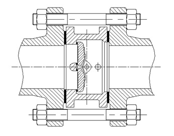對夾連接指閥門兩側(cè)的管道法蘭,通過螺栓夾緊使閥門與管道系統(tǒng)相邊的一種連接方式。示圖如下: