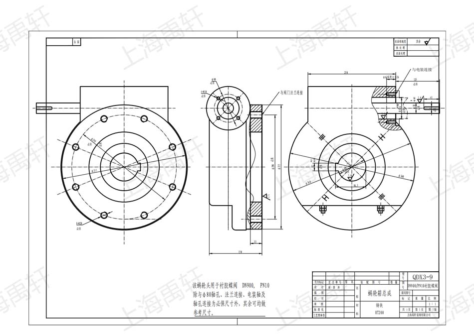 襯膠蝶閥蝸輪頭小樣圖提供:該蝸輪頭用于襯膠蝶閥DN900, PN10 除與φ80軸孔、法蘭連接、電裝軸及軸孔連接為必保尺寸外,其余可均做參考尺寸,這款蝸輪頭為天津國能電廠更換原有蝶閥上的蝸輪頭生產(chǎn)制造的,它的速比89:1,輸出力矩4900Nm,配套蝶閥的通徑為DN800-1000,配套球閥DN400,材料HT200鑄造體,齒輪采用球墨鑄鐵,蝸桿材料為25號鋼。