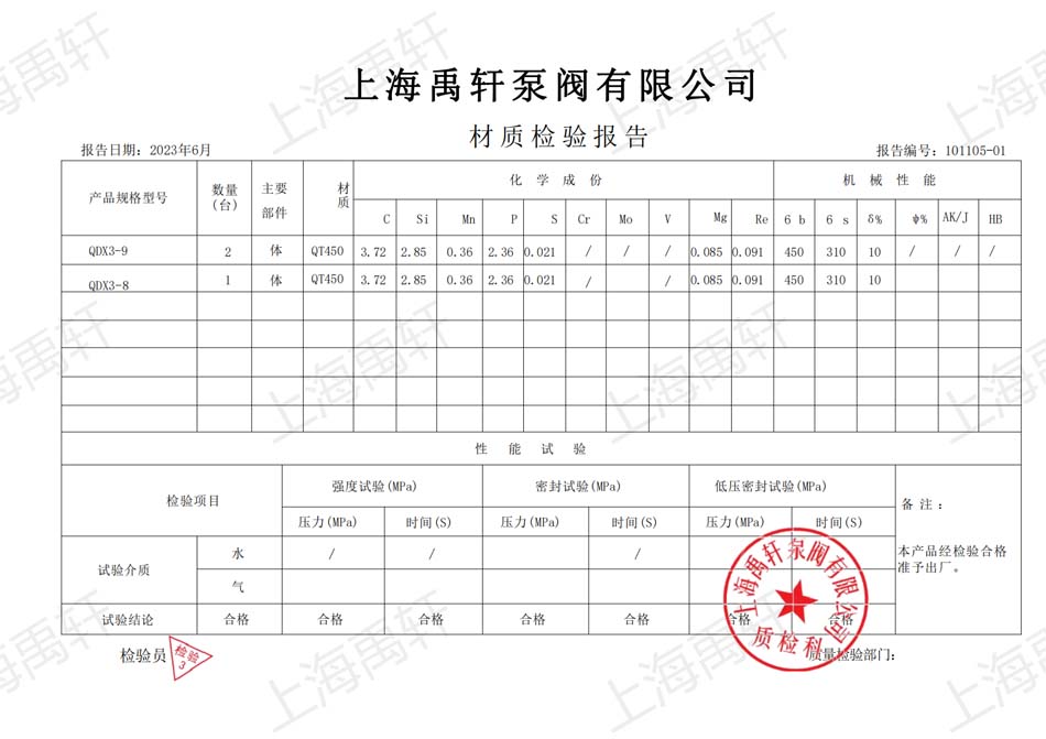 QDX3-8/9型閥門蝸輪箱材質(zhì)檢驗(yàn)報(bào)告單提供。以此款球墨鑄鐵材料蝸輪箱為例,它分為化學(xué)成份和機(jī)械性能檢驗(yàn)內(nèi)容,性能試驗(yàn)內(nèi)容。這兩款蝸輪頭主要用于閥門作為開啟關(guān)閉作用,檢驗(yàn)的作用是看它的材料達(dá)到不達(dá)到標(biāo)準(zhǔn)。