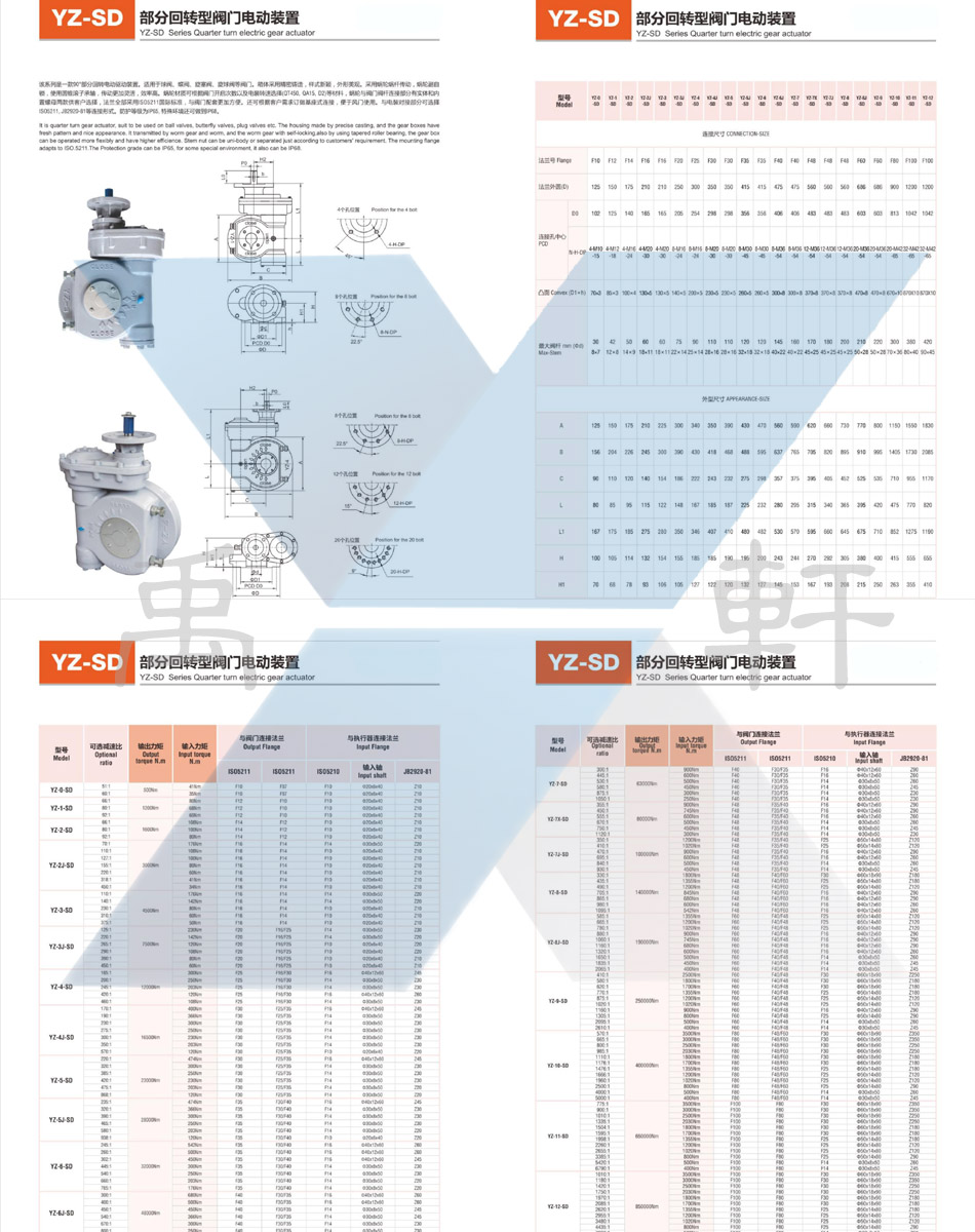 YZ-SD部分回轉(zhuǎn)型閥門電動裝置圖紙 參數(shù),連接尺寸如下:YZ-SD部分回轉(zhuǎn)型閥門電動裝置圖紙 參數(shù),連接尺寸如下:YZ-SD部分回轉(zhuǎn)型閥門電動裝置一款90°回轉(zhuǎn)型閥門驅(qū)動裝置,適用于蝶閥、球閥、旋塞閥、旋球閥等類型閥門。箱體采用精密鑄造,樣式新穎,外型美觀,采用蝸輪蝸桿傳動,蝸輪副自鎖,使用圓錐滾子軸承,傳動更加靈活,效率高,蝸輪材質(zhì)可根據(jù)閥門開啟次數(shù)以及電裝轉(zhuǎn)速選擇,(QT450,QA15,D2)等材料,蝸輪與閥門閥桿連接部分有實(shí)體和內(nèi)置螺母兩款供客戶選擇,法蘭全部采用ISO5211國際標(biāo)準(zhǔn),與閥門配套更加方便.還可根據(jù)客戶需求訂做基座式連接,便于風(fēng)門和通風(fēng)系列擋風(fēng)閥使用.與電裝對接部分可選擇.