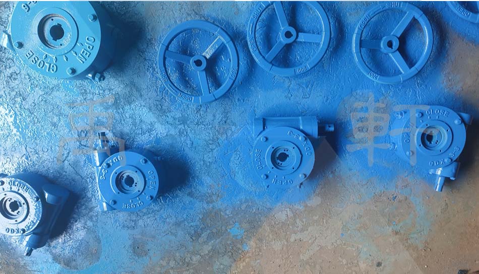 上海禹軒閥門驅(qū)動車間噴油漆現(xiàn)場,4臺QDX3-3單級手動蝸輪箱實(shí)物圖