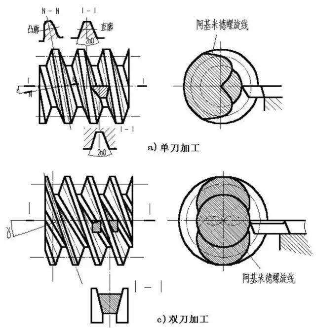 這種蝸桿的端面齒廓為延伸漸開線,法面(N—N)齒廓為直線。ZN蝸桿也是用直線刀刃的單刀或雙刀在車床上車削加工。