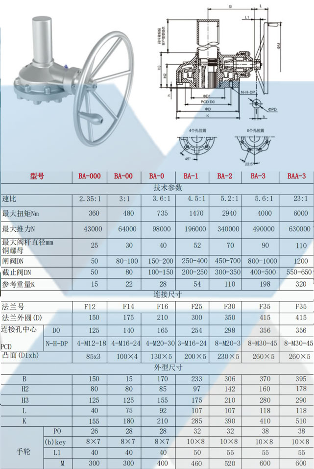 BA傘齒輪,多回轉(zhuǎn)型閥門手動(dòng)裝置應(yīng)用說(shuō)明:V-20,V-40,BA-000,BA-0, BA-1,BA-2,BA-3, BAA-3,MY-V5,MY-V6等型號(hào)傘齒輪 該裝置是直接安裝在閘閥和截止閥等閥門上的手動(dòng)裝置,該裝置采用弧齒錐齒輪和平面推力承軸,有運(yùn)轉(zhuǎn)平穩(wěn)、扭矩大、噪音小、效率高的優(yōu)點(diǎn)。在所有的結(jié)合部,采用下密封墊全密封處理,達(dá)到了防水、防油漏的效果,防護(hù)等級(jí)為IP65。手輪和閥桿罩可根據(jù)用戶需求定制。