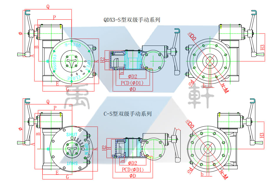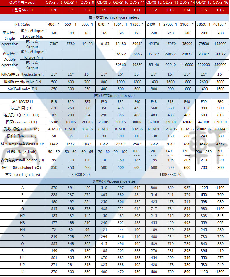 該系列是小蝸輪箱與大蝸輪箱對接組合成為二級傳動蝸輪減速增壓機構(gòu),提高了機械總效率,輸入小力矩,開動大閥門,使操作人員省力,每種型號提供多個傳動比,特殊型可輸出360°無限多回轉(zhuǎn),能更好的匹配不同規(guī)格的閥門。