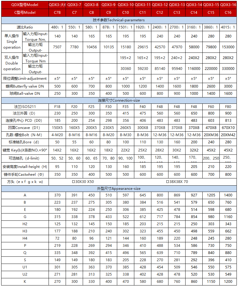 QDX3雙級渦輪頭是一款90°部分回轉(zhuǎn)驅(qū)動裝置,QDX3雙級渦輪箱,DN800蝶閥裝置,DN1000蝶閥手動執(zhí)行器適用于球閥、蝶閥、旋塞閥等類型閥門。該系列是小蝸輪頭配套大蝸輪箱對接組合成為二級傳動蝸輪減速增壓機構(gòu),提高了機械總效率,輸入小力矩,開動大閥門,使操作人員省力,每種型號提供多個傳動比,特殊型可輸出360°無限多回轉(zhuǎn),能更好的匹配不同規(guī)格的閥門。